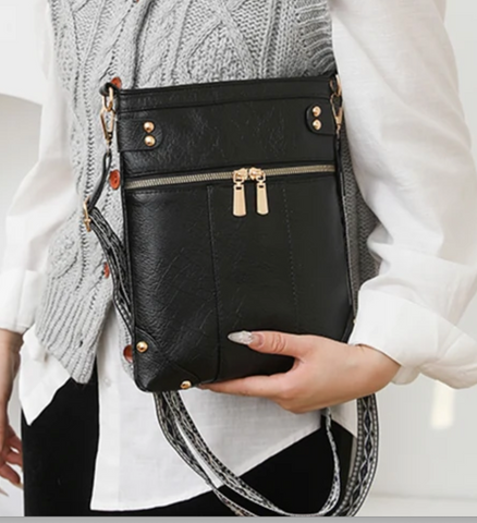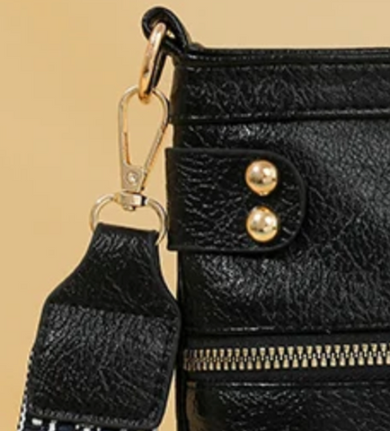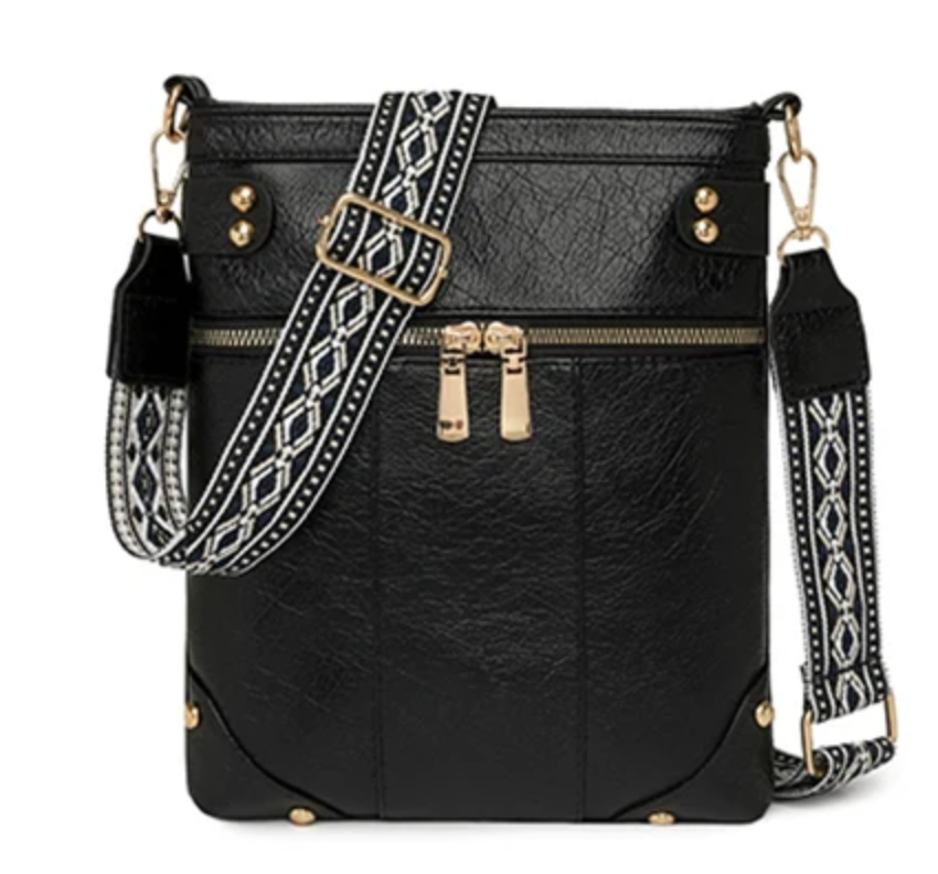 Perfect slim size Crossbody. Textured faux leather, strong gold hardware, zipper front pocket, interior lining and pocket. Removable and adjustable crossbody guitar strap.