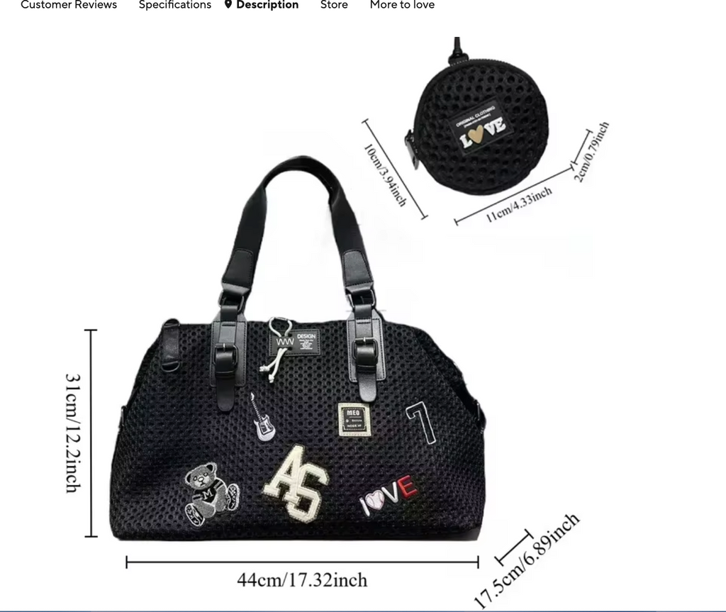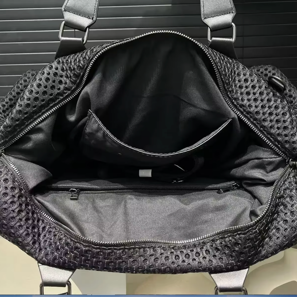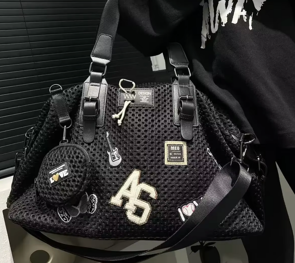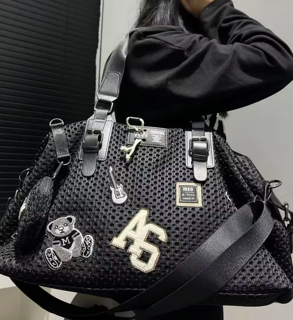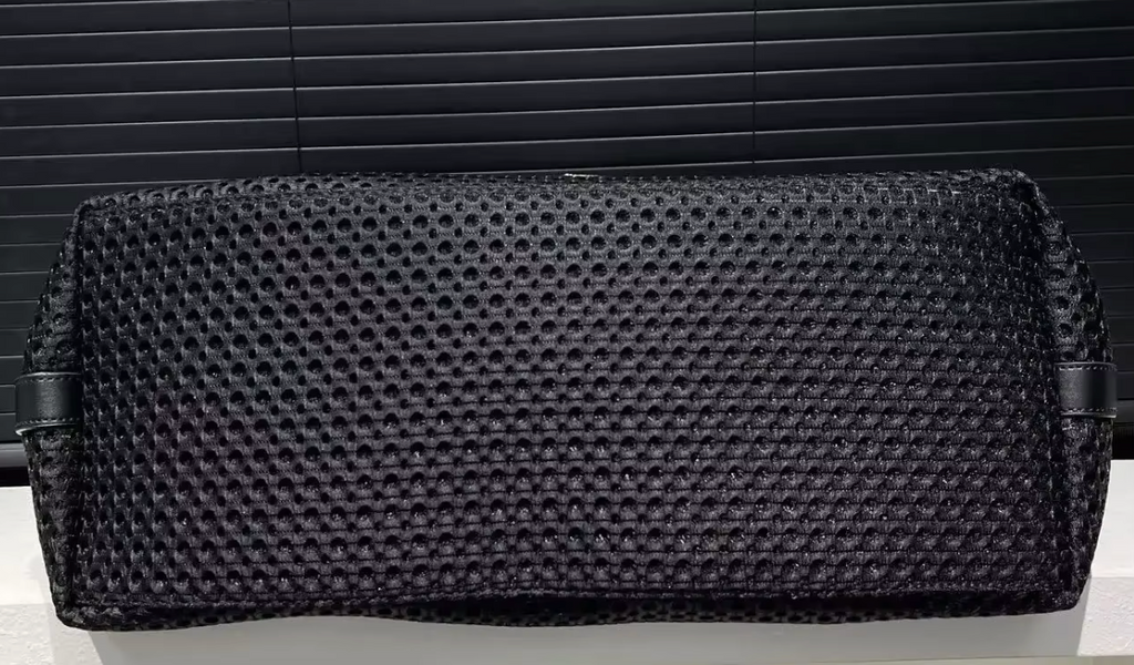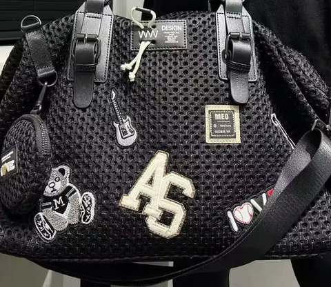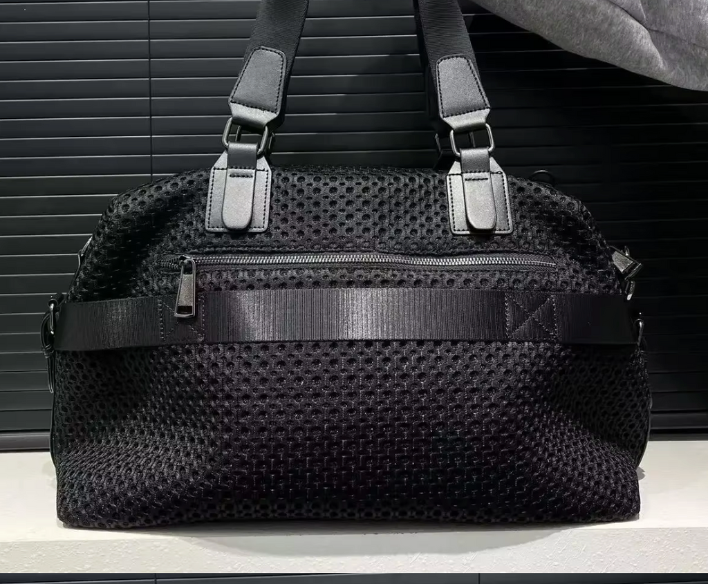 Black STRONG Leather Mesh design with leather handles, additional shoulder strap, large lined interior.