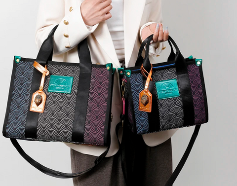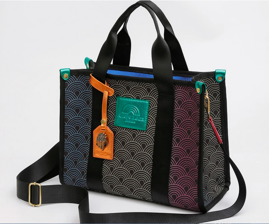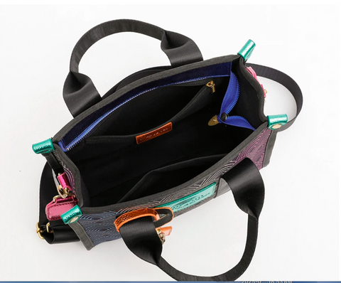 This is gorgeous...leather sturdy reinforced handles and detachable and adjustable wide shoulder strap. Beautiful geometric design pattern, fully lined, with pockets and zip pocket.