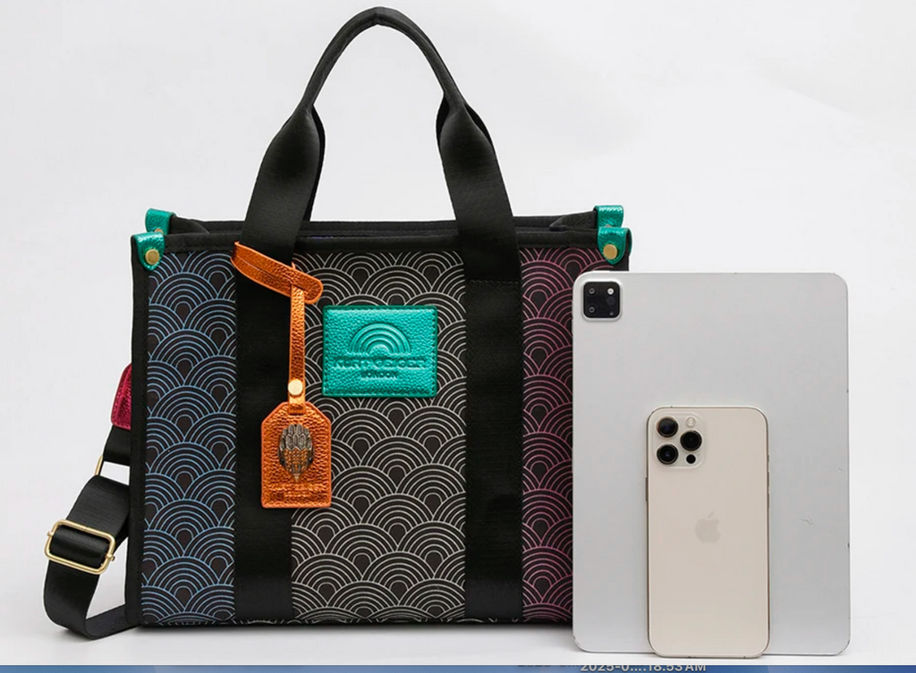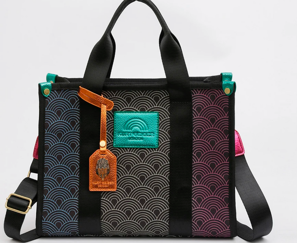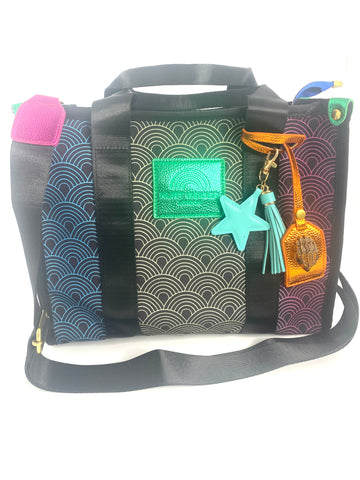 This is gorgeous...leather sturdy reinforced handles and detachable and adjustable wide shoulder strap. Beautiful geometric design pattern, fully lined, with pockets and zip pocket.