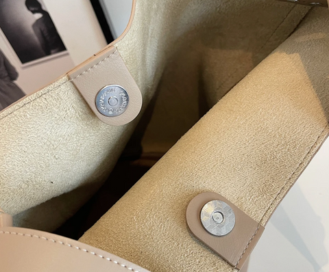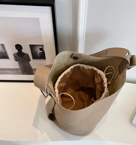 Hammered leather with adjustable strap. Very sturdy shoulder strap and drawstring bag inside for essentials.