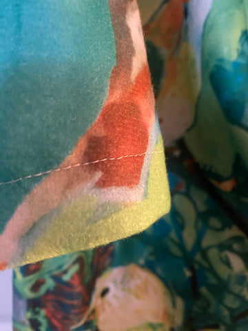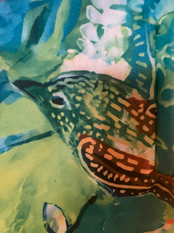 Nothing more classy than an eye catching TRENCH COAT. From early 2000 and in EXCELLENT CONDITION. Not lined. A great piece for a complete LOOK! Two front pockets. Black buttons, flat collar. Well made.Beautiful scenic of TROPICAL BIRDS