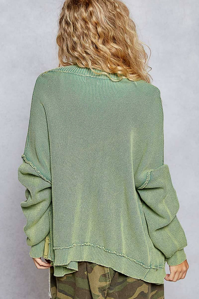 Designed in long sleeve relaxed fit cardigan top in cotton sweater with woven patch, out seam detailing, front pockets, rib band point, vintage washing, solid color.