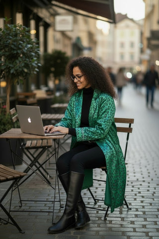 Emerald green leopard print, not lined, front pockets , 4 " cuffs and in great condition !