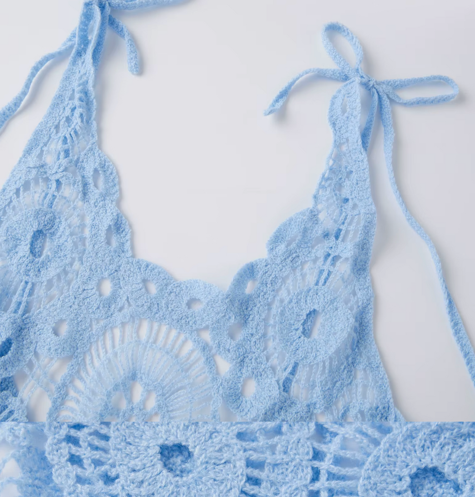 BEAUTIFUL Lightweight CROCHET KNIT, tie shoulder straps ,uneven hem,open back makes this a very sexy piece!