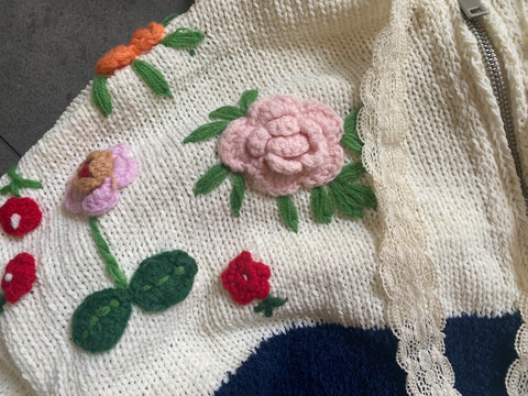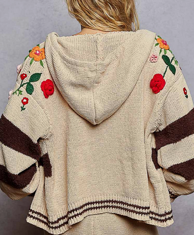 Stunning Designed zip up hoodie by POL. Balloon sleeves, relaxed fit top in chenille sweater with 3D embroidered detail pointed striped pattern.
