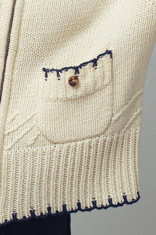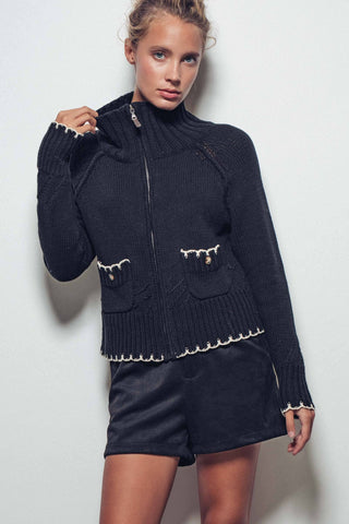 Timeless sophistication meets everyday ease in this elevated ribbed knit zip-up. Crafted from a soft, mid-weight fabric, it features refined contrast tipping at the hem, cuffs, and pockets for a subtle yet striking finish. A structured mock neck and full-length zipper offer warmth and styling flexibility, while extended ribbed cuffs with thumbholes add a modern, cozy detail. Decorative flap pockets with button accents complete the look with tailored charm. Perfect for layering or wearing on its own, this piece adds polish to any outfit.
