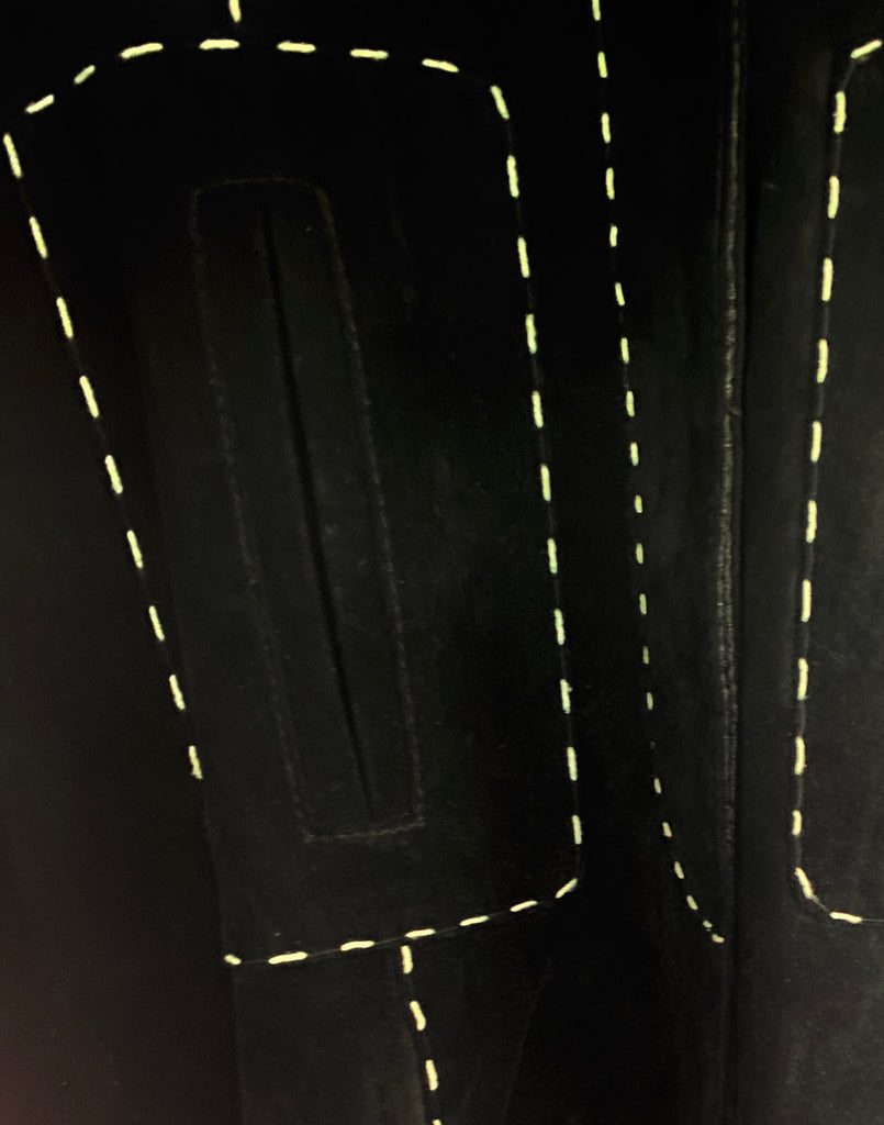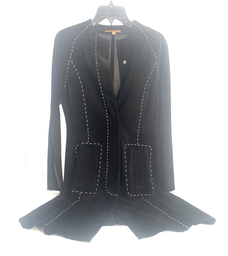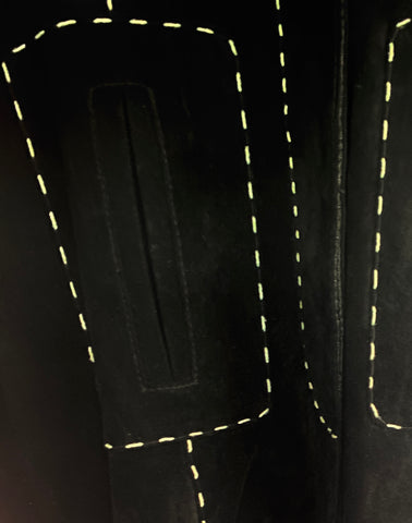 Black suede, Snap front, split sleeves, white stitching, two front real pockets. Fits sleek.