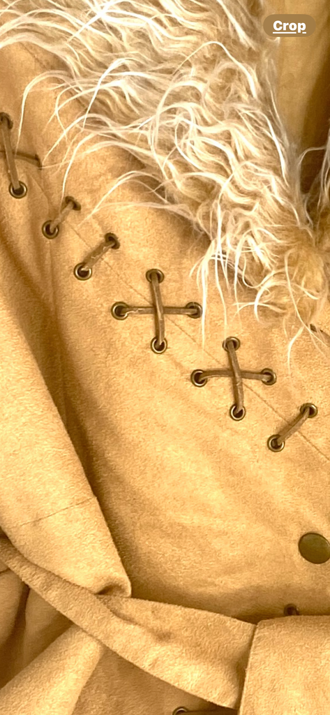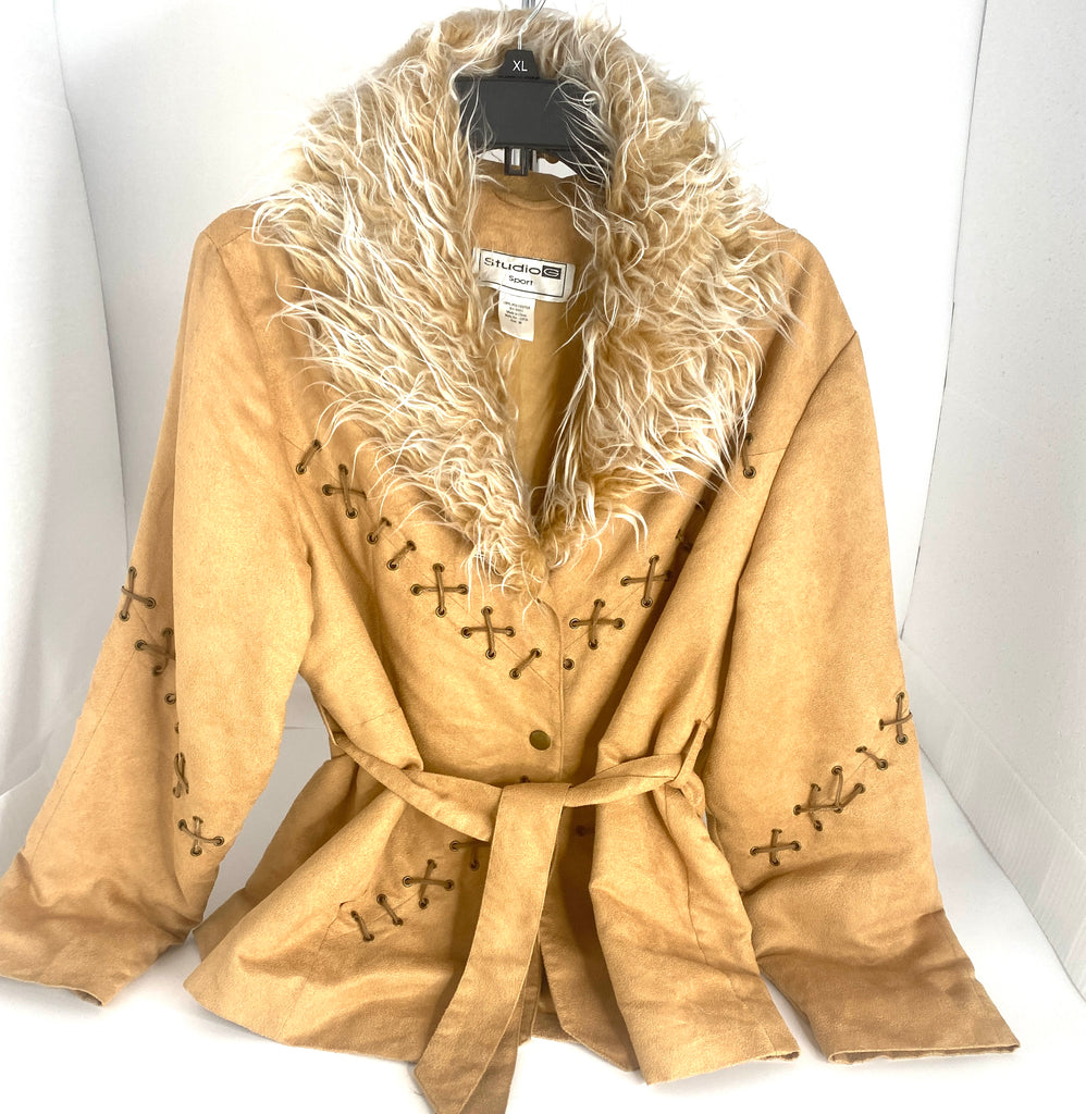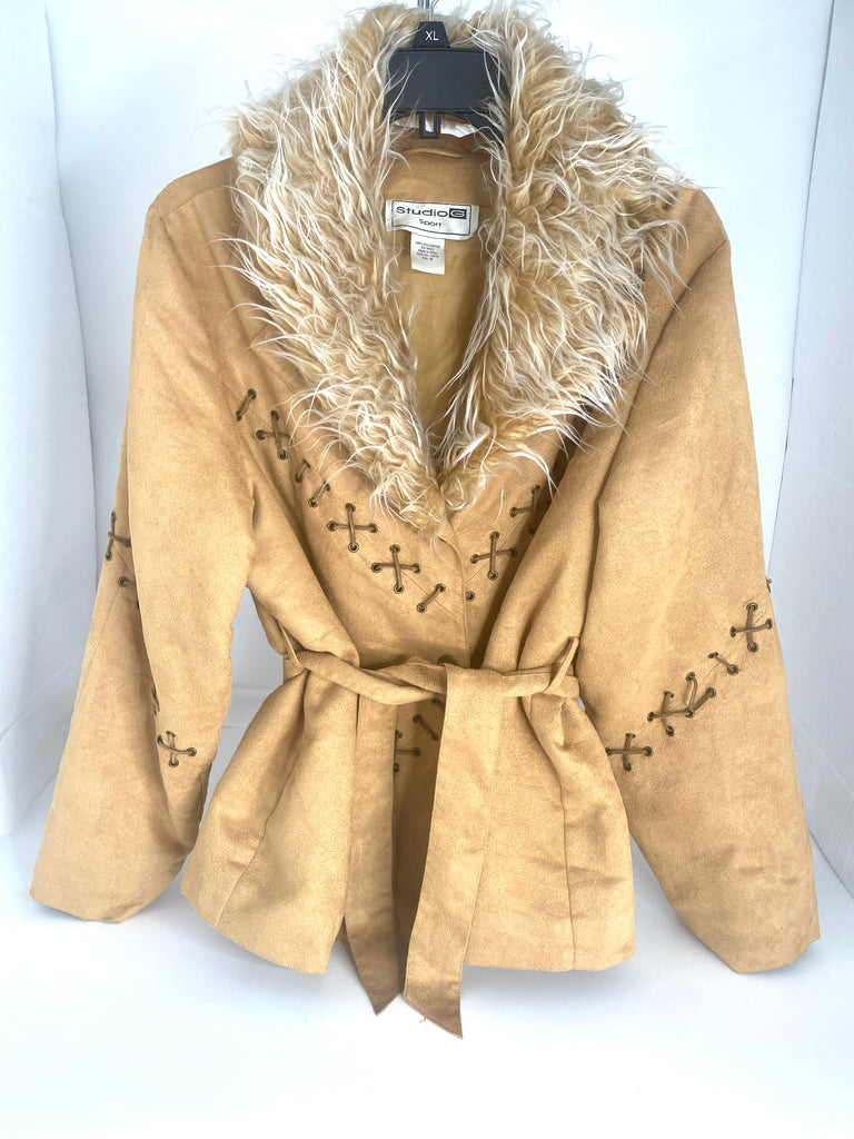 Studio G apparel was as popular as Studio 54 back in the day of the 70s era. Beautiful light suede wrap belted jacket, faux fur and leather cross stitch.